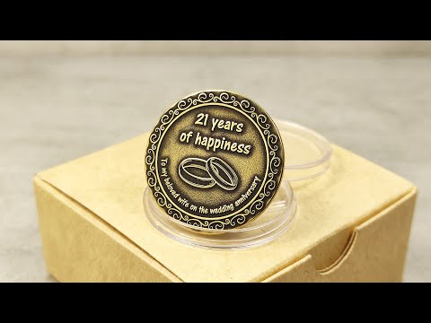 This elegant brass coin is a perfect 21st wedding anniversary gift for your wife. Featuring two wedding rings and the inscription "21 years of happiness" it beautifully symbolizes love, loyalty, and shared memories. Personalize it with names, a date, or a heartfelt message to make it a one-of-a-kind keepsake. Crafted from high-quality brass, it boasts a warm golden tone and comes in a stylish presentation box. Ideal for celebrating a brass anniversary or as a romantic gift for your beloved partner. A timeless symbol of love and commitment, this coin will make your special day unforgettable.