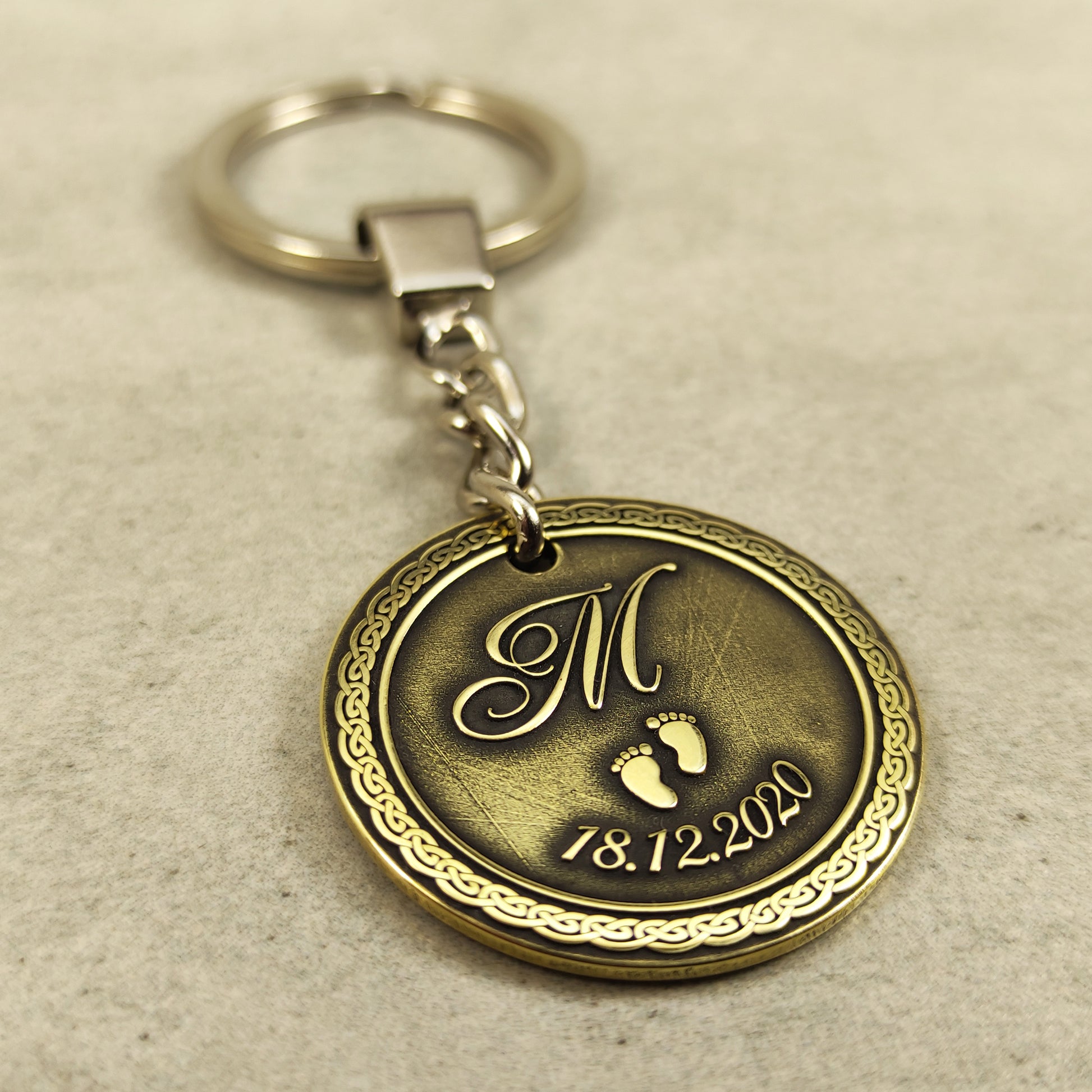 Brass Coin Keychain with Engraving – Personalized Gift with Initial and Date
