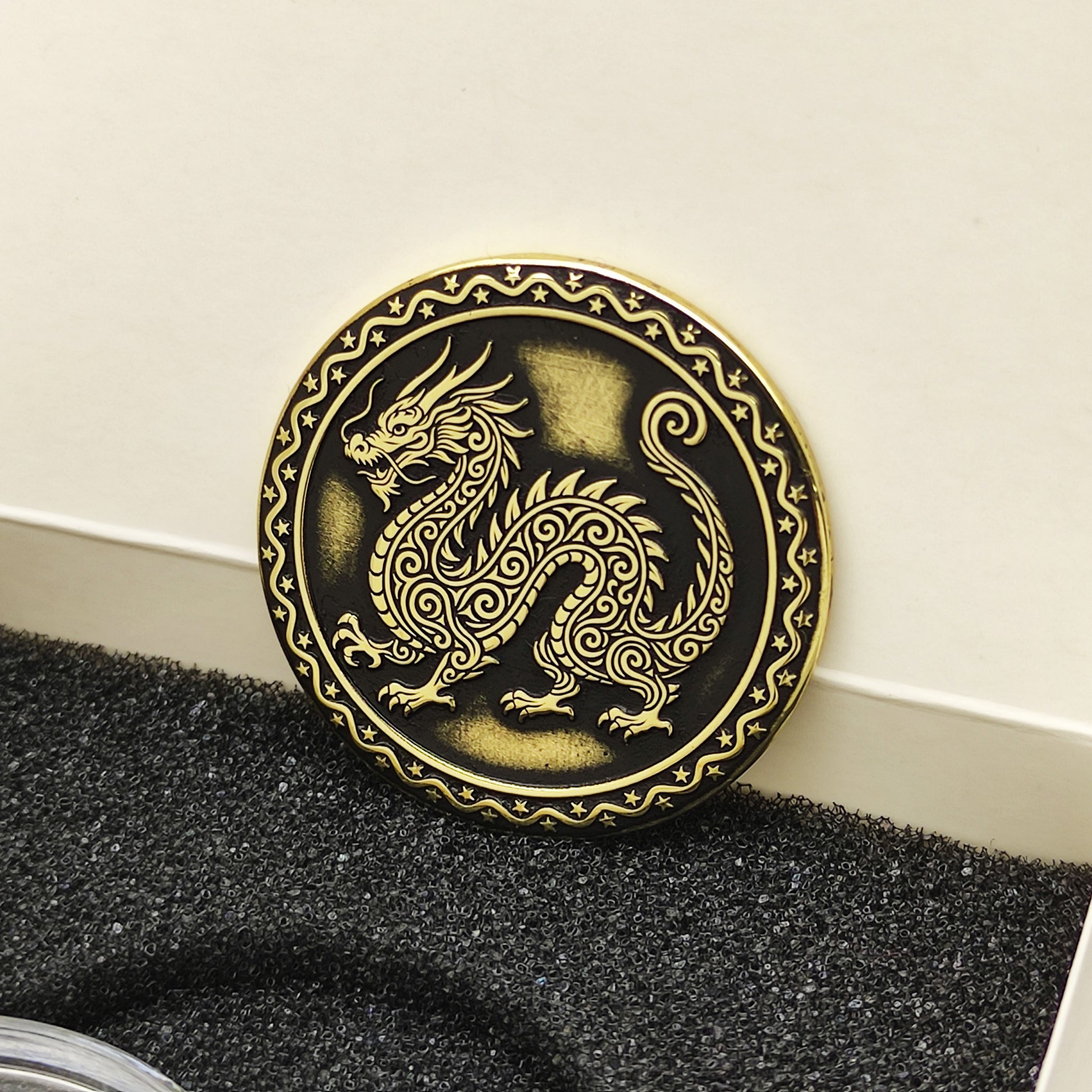 The "Year of the Dragon" brass coin is a powerful symbol of strength, wisdom, and success according to the Eastern Zodiac. Made from premium brass with an antique finish, it features a beautifully detailed engraved dragon design. Perfect as a collectible, lucky charm, or personalized gift for someone special. Custom engraving is available to make this coin truly unique and meaningful. Ideal for birthdays, holidays, or as a good luck token for the Year of the Dragon. A perfect blend of craftsmanship, symbolism, and elegance.