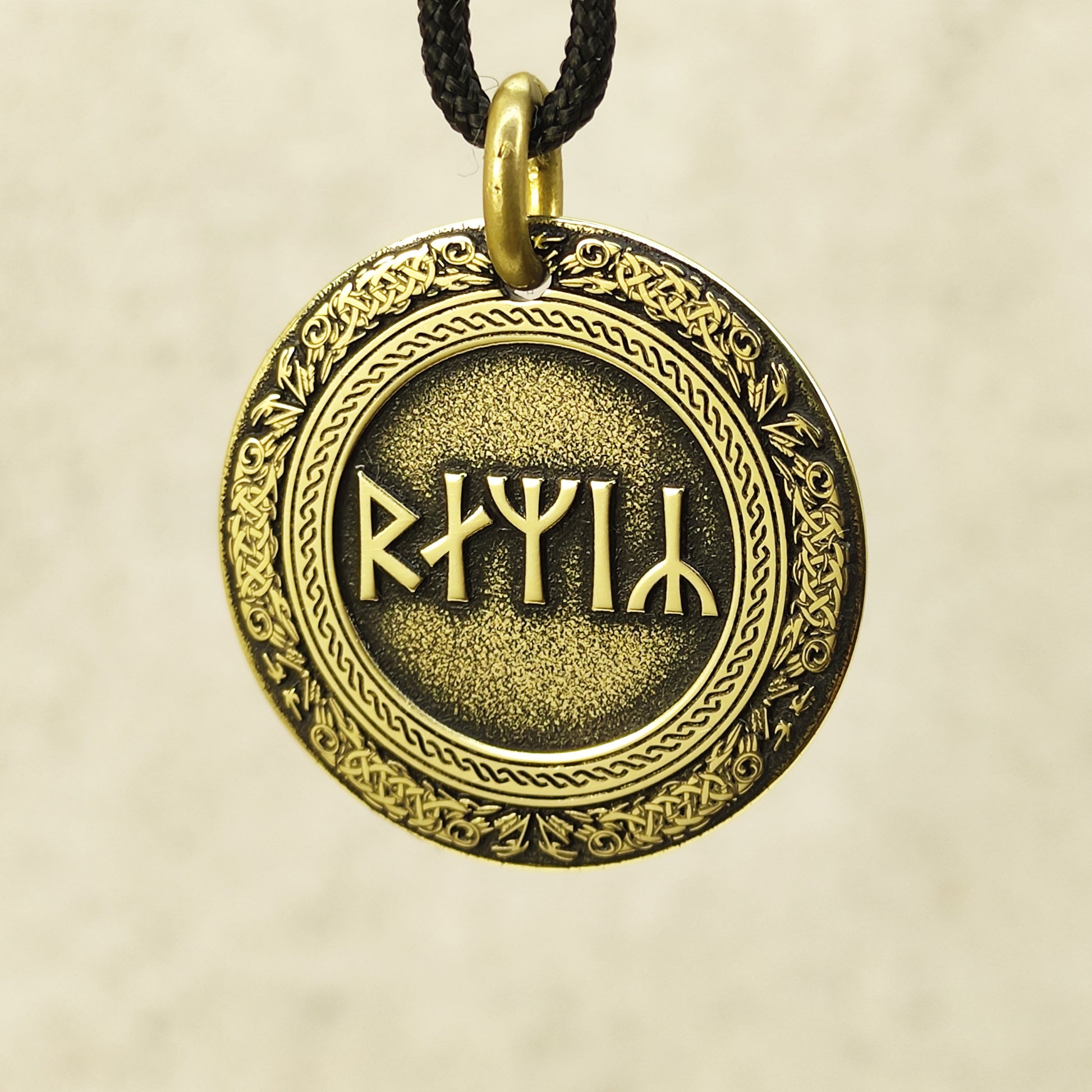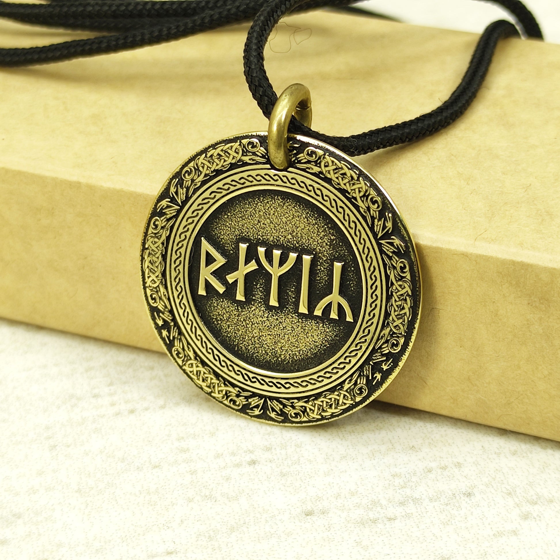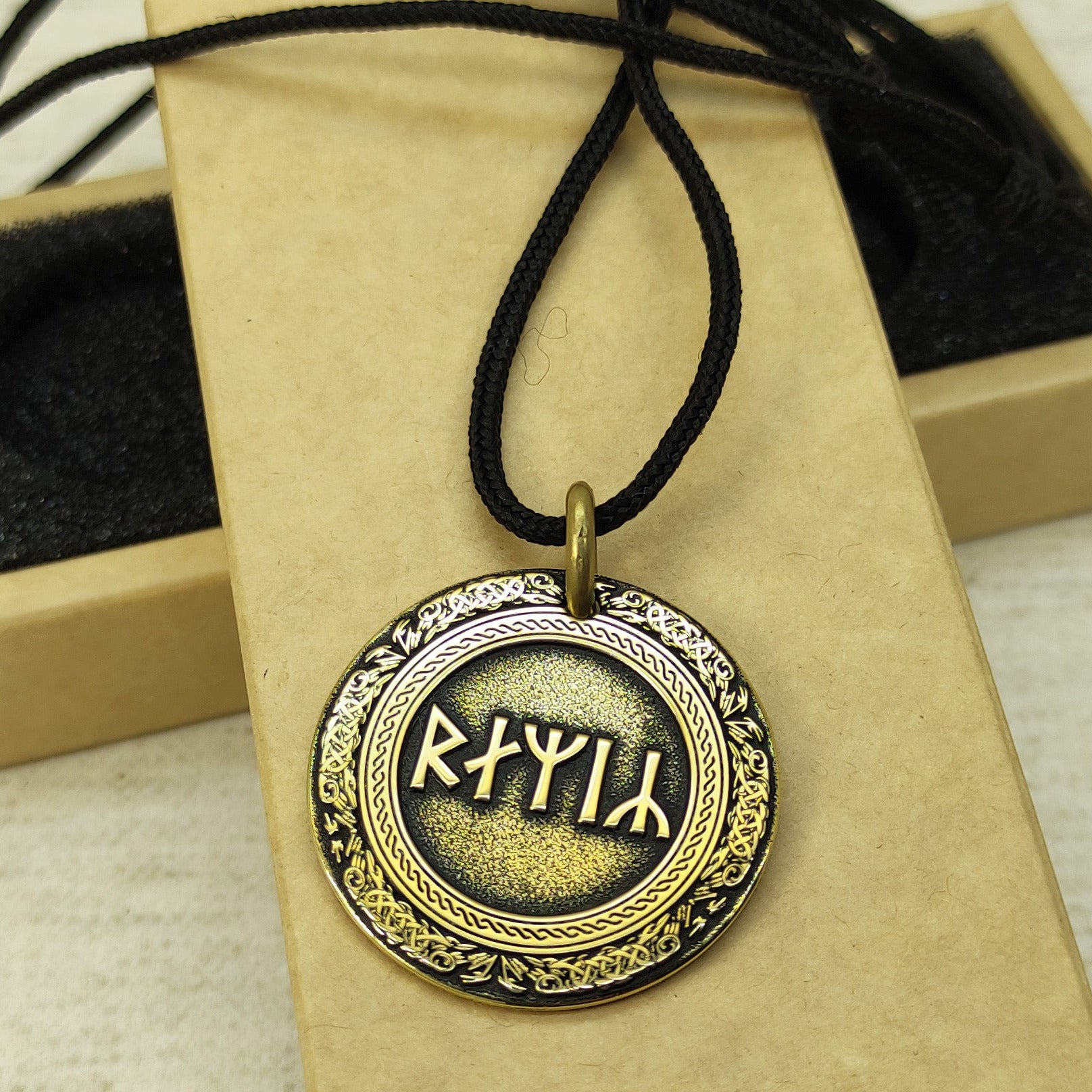 Brass Rune Coin Pendant with Personalization - Norse Amulet Gift