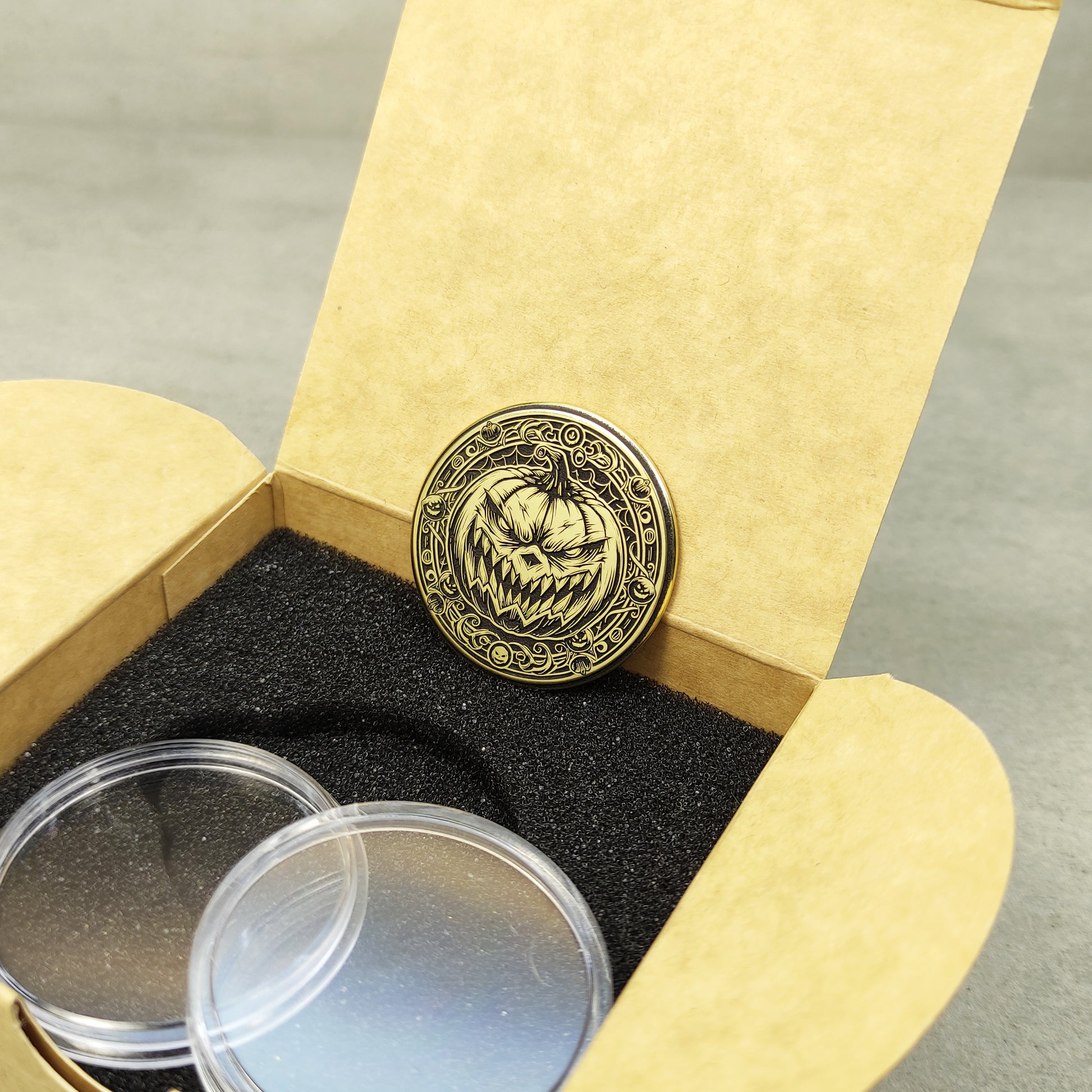 The brass "Scary Pumpkin" coin with deep engraving is a unique Halloween-themed accessory created for fans of dark aesthetics and collectible items. The detailed engraving of the sinister pumpkin paired with decorative ornamental elements gives the coin a bold and atmospheric look. This piece makes a great addition to Halloween décor or a memorable gift for friends and collectors. Personalization on the back allows you to add initials, a date, or a short message to make the coin truly unique. Crafted from quality brass, the coin has a solid feel and an impressive visual appearance suitable for collectors and fans of symbolic items. A perfect choice for Halloween gifts, themed events, and collectible displays.