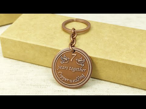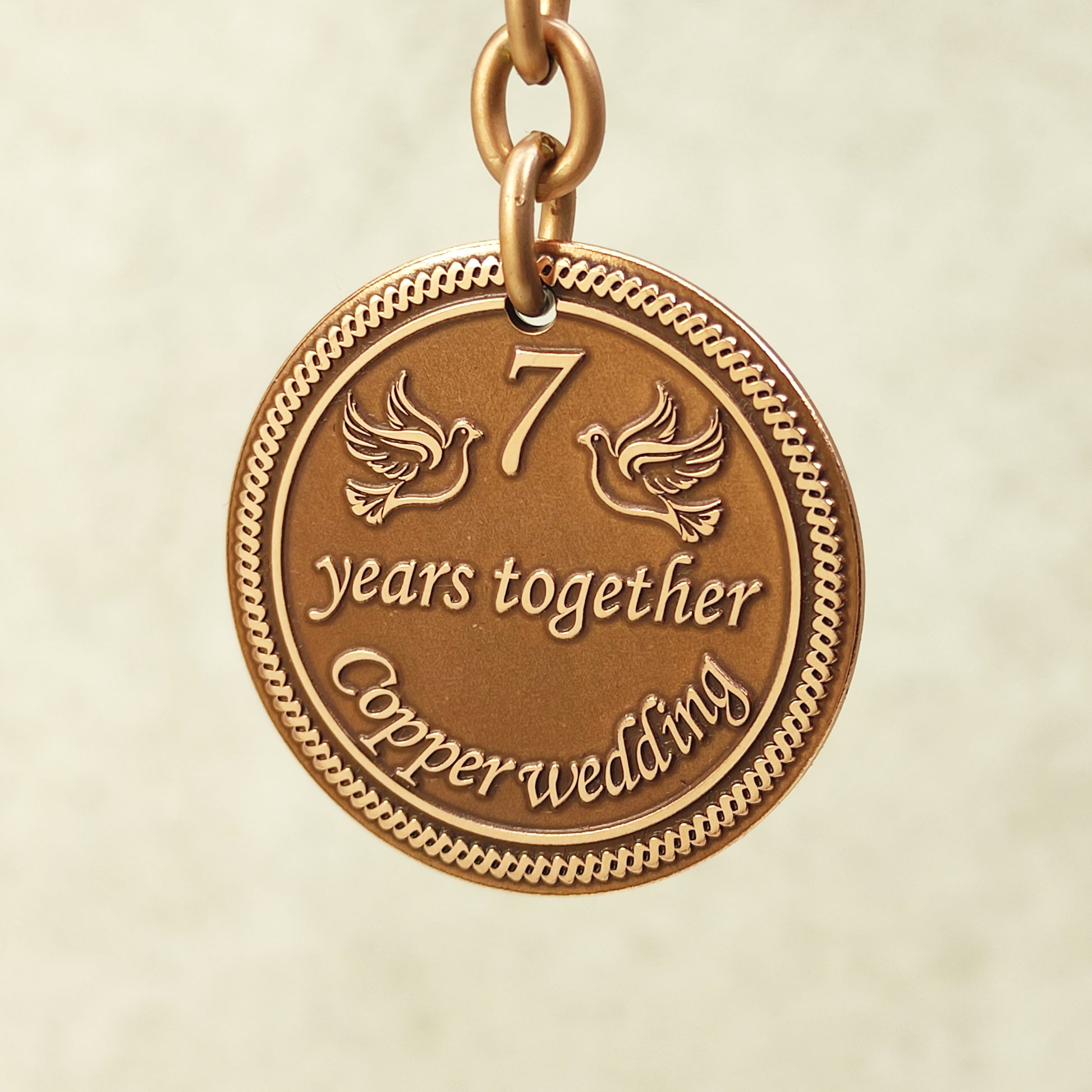 This copper coin keychain is a meaningful and beautifully crafted gift for the 7th wedding anniversary, symbolizing strength, love, and unity. The design features two doves and the inscription "7 years together • Copper wedding", creating a romantic and memorable keepsake. Its warm copper tone and detailed relief give the accessory a premium appearance, making it perfect for a husband, wife, or couple celebrating their copper wedding. Personalization is available — you can add a name, date, or short phrase to make the gift truly unique. The keychain is both symbolic and practical, offering lasting emotional value and everyday usability. A thoughtful and elegant anniversary gift that highlights seven years of love and commitment.