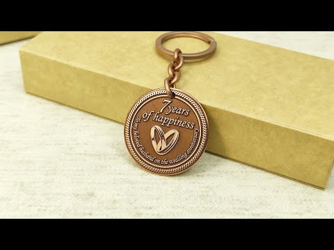 The copper keychain coin "7 Years of Happiness" is a meaningful and stylish gift for a husband on the 7th wedding anniversary, also known as the Copper Anniversary. Made from genuine copper, it symbolizes warmth, durability, and lasting love. The coin features two wedding rings and the phrase “7 years of happiness,” expressing gratitude and affection. The back side can be customized with a name, date, or personal message. This keepsake keychain is both elegant and sentimental, a perfect reminder of seven wonderful years together. Ideal as a romantic anniversary gift for your beloved husband.