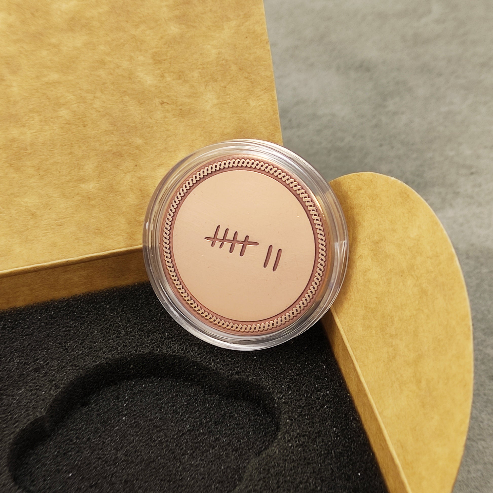 The copper "Tally Mark" coin is designed to celebrate the 7th wedding anniversary and makes a modern, symbolic copper wedding gift. The seven tally marks in the center represent the years spent together, turning the coin into a meaningful keepsake for a husband or wife. The smooth central surface provides space for personalization, such as a name, date, or short message. Its warm copper tone, decorative border, and minimalist design give the coin a refined and elegant appearance. This item is a perfect anniversary present that highlights the importance of the occasion and serves as a lasting reminder. The coin comes in a gift box, making it ready for presentation. A great choice for those seeking a unique and personalized 7th anniversary gift.
