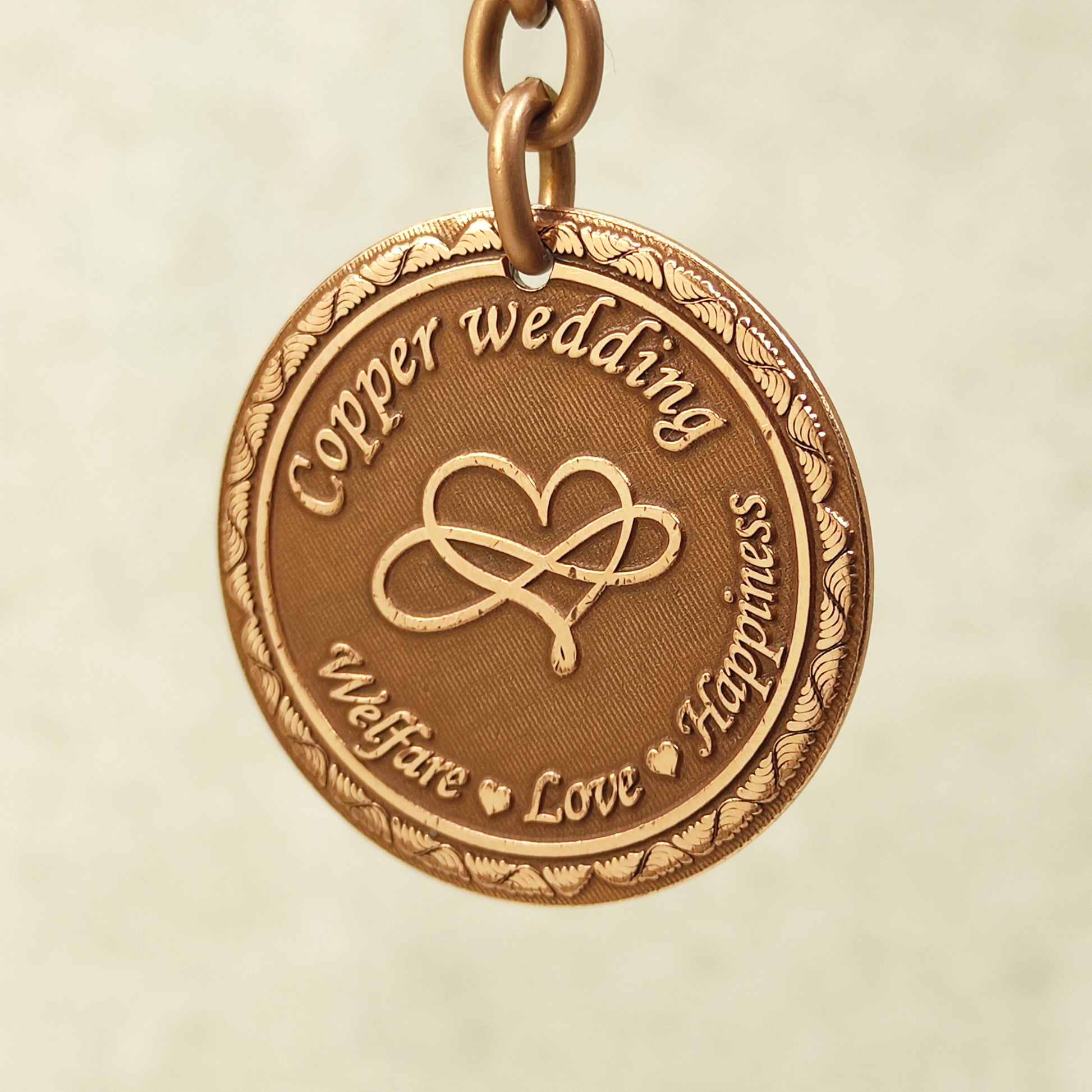 This copper coin keychain is a meaningful and elegant gift for the 7th wedding anniversary, symbolizing strength, love, and long-lasting unity. Made in a warm copper tone, it features a detailed relief design with intertwined hearts and engraved wishes of love, happiness, and welfare. The keychain is a perfect keepsake for a husband, wife, or couple celebrating their copper wedding anniversary. Personalization is available, allowing you to add a name, date, or short message to create a unique and memorable gift. The accessory has a premium look and is suitable for everyday use. A thoughtful and symbolic present that brings lasting emotional value.