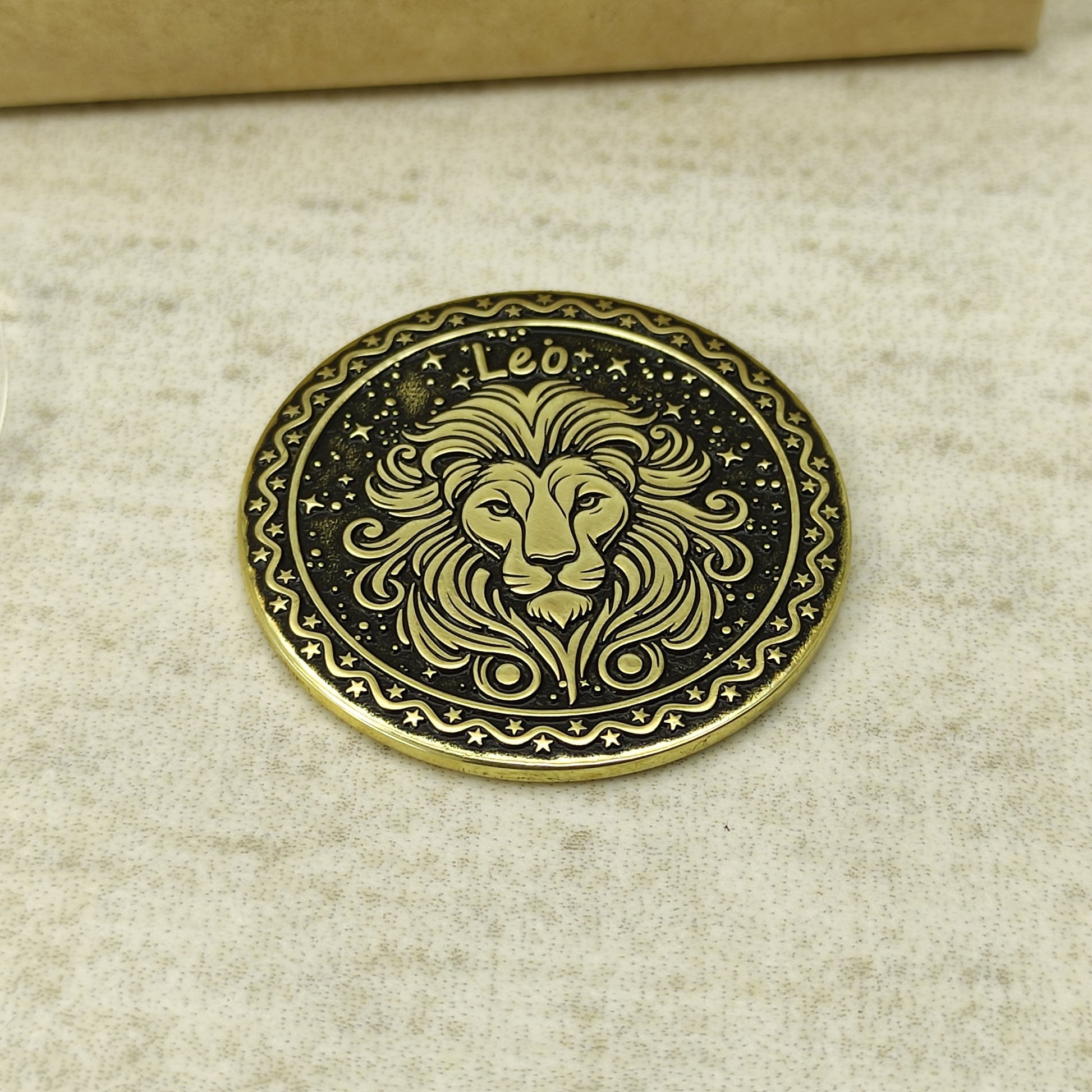 The brass zodiac coin Leo is a stylish and symbolic gift for anyone born under this strong and charismatic astrological sign. The detailed relief of the lion and starry background gives the coin an expressive and premium appearance. High-quality brass provides an elegant finish and solid weight, while the dark patina enhances the depth of the design. Personalization with a name, date, or short text makes this coin a unique and meaningful keepsake. It is perfect as a birthday gift, a collectible item, or a personal talisman for astrology enthusiasts. The coin comes in a protective capsule to preserve its beauty and value. An ideal choice for anyone looking for a high-quality zodiac-themed accessory.