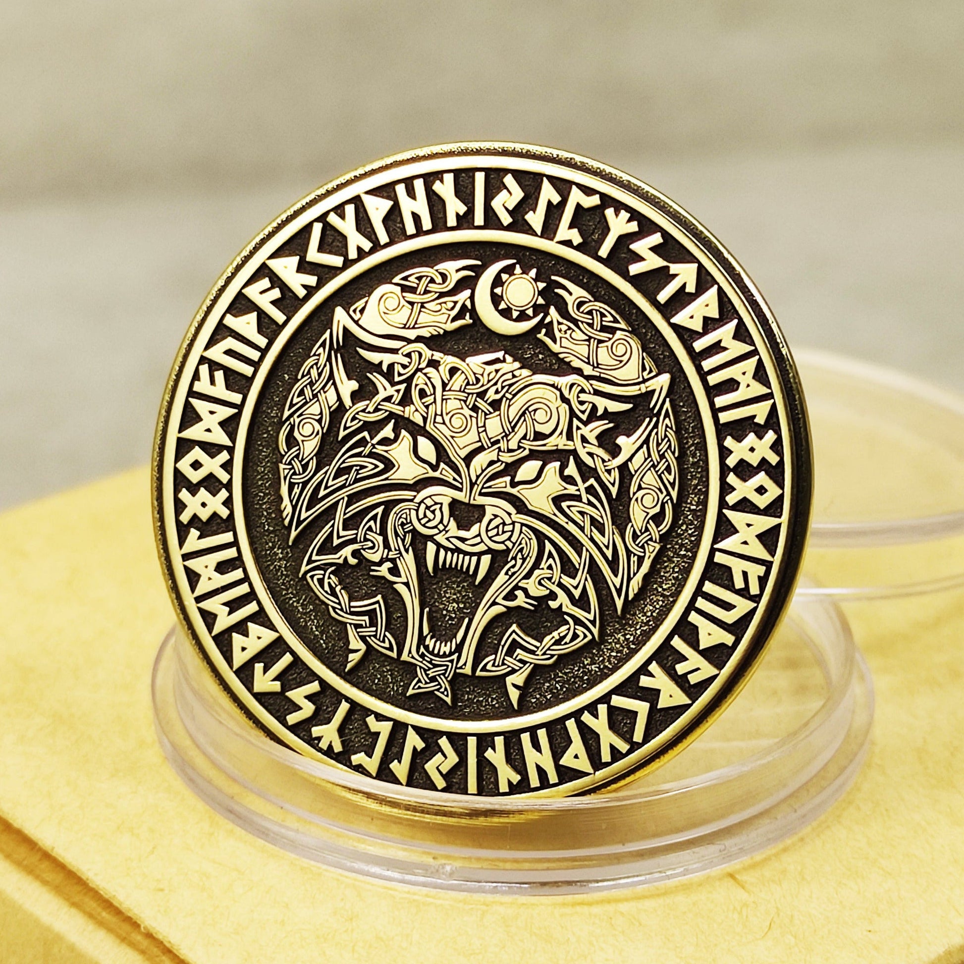 Personalized Brass "Fenrir Wolf" Coin with Runic Engraving