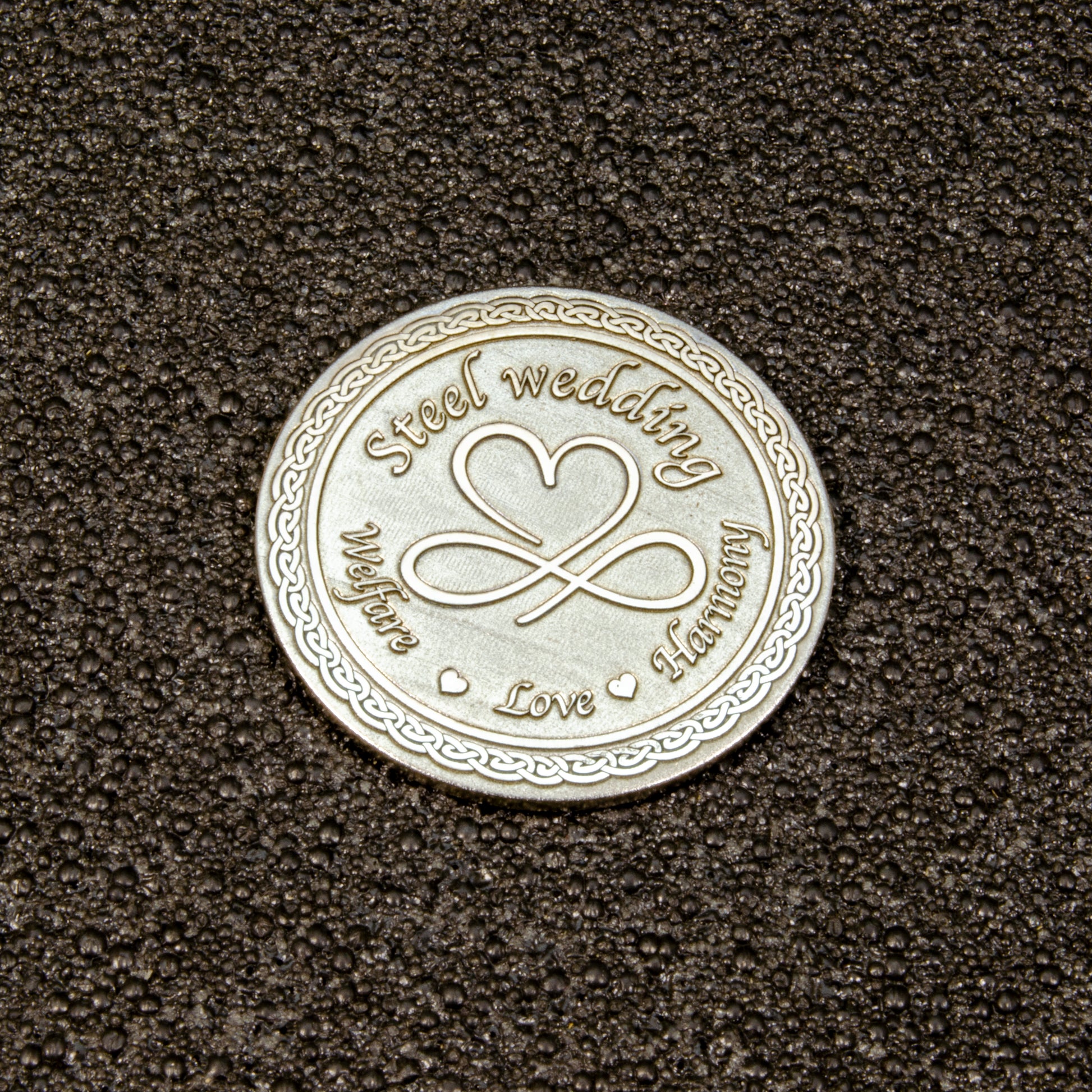 This personalized steel anniversary coin is a meaningful and symbolic gift for celebrating the 11th wedding anniversary, also known as the steel wedding. Its elegant design with a heart and infinity symbol reflects harmony, love, and strong marital bonds. The refined detailing makes this coin a beautiful keepsake, while the option to personalize it with a name, date, or short message adds a unique and sentimental touch. Perfect for couples celebrating 11 years of marriage, this coin becomes a lasting reminder of commitment and shared memories. It fits wonderfully into romantic anniversary traditions and makes an exceptional steel anniversary gift. A perfect choice for anyone seeking a stylish, high-quality, and personalized anniversary keepsake.